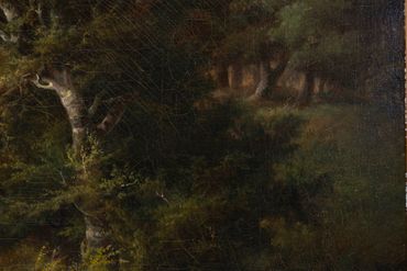 The diagonal composition, drawing the eye deep into the wooded path, is typical of Koekkoek’s design principles. The monumental trees, softly curving light, and meticulous detailing all point to a compositional model widely used and adapted by his pupils.