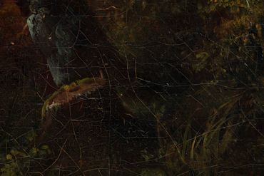 The UV examination reveals scattered retouching and areas of older restoration, mainly within the foliage and sky. The canvas has been professionally relined, with a stable paint surface and an even craquelure consistent with age and authenticity.